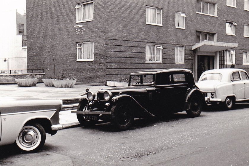 10148 ALK 228 Speed 20 SA Mayfair pvt 007 Georgano photo London W2 March 1961. This is a new find for the SA Register and was unknown to AOC until this photo appeared. By elimination Nick Simpson has been able to apportion Ch 10148, which is one of the rare saloons by the Mayfair Carriage Co. Charles Follet was able to exert his influence upon Mayfair designs and when customers required a four door car they were steered toward Mayfair, rather than VDP. The coachwork was cleverly constructed for light weight, using alloy castings and extruded window frames in the doors. This design gave slim screen pillars allowing excellent visibility. Several had fabric tops. ALK 228 looks a little out of place between the late fifties tinware parked in London W2 in 1961. It has lost its running boards and is equipped with a rather inelegant front bumper. In cars without running boards, flying stones from the front wheels often damage the lower forward area of the rear wings. In this case, a rather crude and oversize rubber shield has been added to the nearside rear wing for protection.