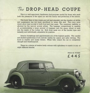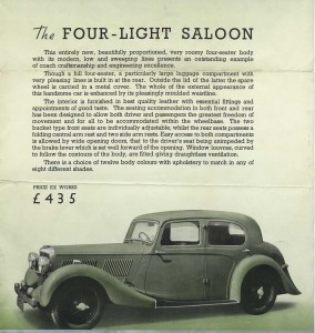The 12/70 was produced from 1937 to 1940 in two series, designated SB and SC 13.22. It was aimed at the “quality four cylinder with a sporting flavour” market. Standard coachwork was by Mulliners of Birmingham, their first major contract from Alvis, and comprised a neat four door saloon and a two door drophead coupé, priced at £435 and £445 respectively.