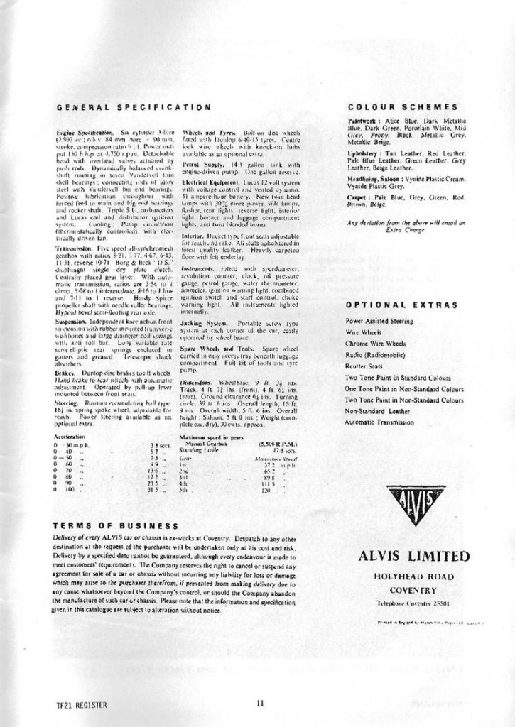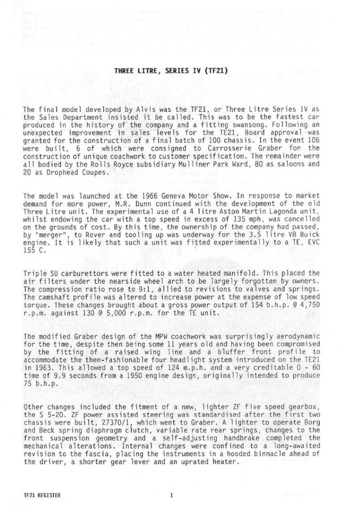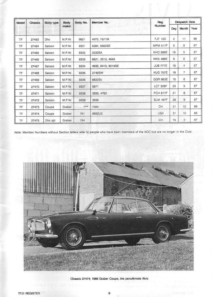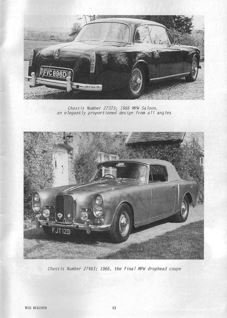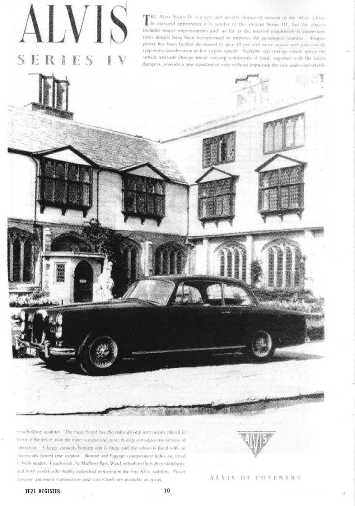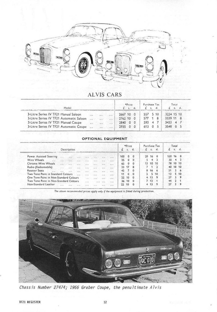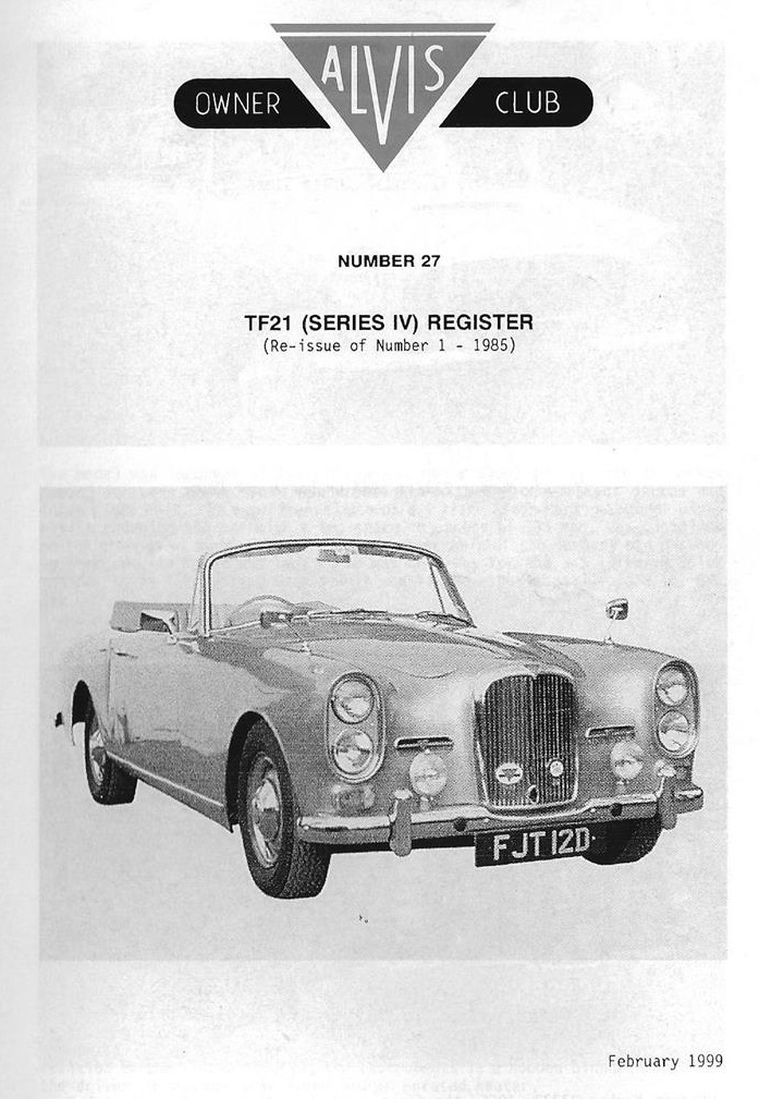 I was very interested in John Fox’s contribution re the TF21 and I would like to add a little to it. In 1974 I acquired cars numbers 27471 and 27472 which are certified by Alvis and Red Triangle as the last two cars to leave the factory. There were other chassis that went to Graber in Switzerland which would seem to have included 27470 which John Fox describes as the last of the line of Alvis cars. Car no 27472 was I understand supplied to the proprietor of a chemical company at Loughborough and and when I acquired it from his widow, the mileage was 19000 and is now just on 100,000. Car number 27472 I understand was supplied to the president of Champion Spark Plugs and has a Webasto roof, electric windows and reclining seats. I acquired it from the second owner, Lord Baden Powell when the mileage as I recall was 73,000. Both cars were advertised in the same AOC Bulletin. I decided on 27472, an automatic saloon, on account of the lower mileage. I was then advised by the owner’s business manager that she had decided not to sell and so I went ahead with 27471 from Lord Baden Powell, only to be advised that 27472 was available to me after all so I took that one as well knowing that I could make a later decision on which to keep. I still have them both.
