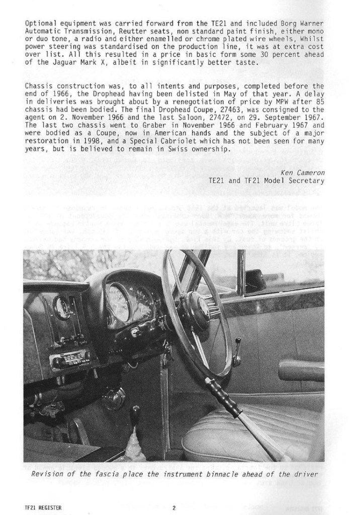 The Mulliner, Park Ward coachwork is unique as being the only car for which Rolls-Royce produced coachwork for another car maker. Of the 100 TF21s they produced, 20 were drophead coupes of which 12 had zf manual gearboxes. 39 of the saloons had zf boxes.