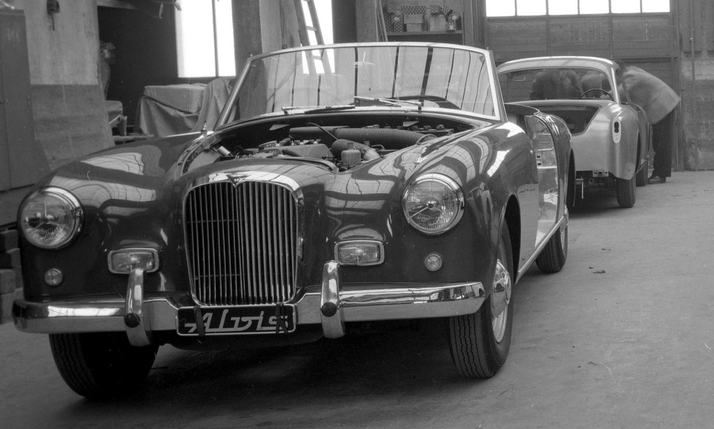 Most of our archive photographs have been identified and many are on this website. Some languish awaiting further clues as to what they are or when they were taken. This new image (donated by Steve Wright) is probably the 1957 Earls Court Motor Show car being prepared in the Graber works.
