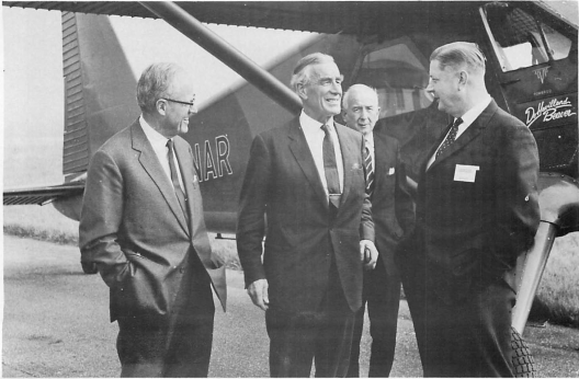 A capable performer, it was subsequently lent to Mr. Parkes on an indefinite basis as a mobile test bed. It was finally disposed of on the orders of Lord Stokes and found a home in Canada, where it was converted into a useful amphibian. It is pictured here on the occasion of the opening of the Champion Sparking Plug factory in Lancashire, De Havilland having their own factory in the neighbouring county of Cheshire. On the left of the group is Bill Martin-Hurst, Managing Director of Rover Limited, whilst A. B. Smith, Champion’s Production Director, appears in the photograph second from the right.