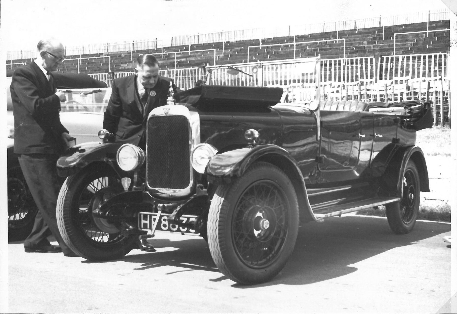 Peter Hull, longtime VSCC Secretary and “Professor” Jimmy Edwards when the car was their official car in the VSCC film “The Vintage Spirit”, a professionally made film to celebrate the 50th anniversary of the VSCC in 1984.